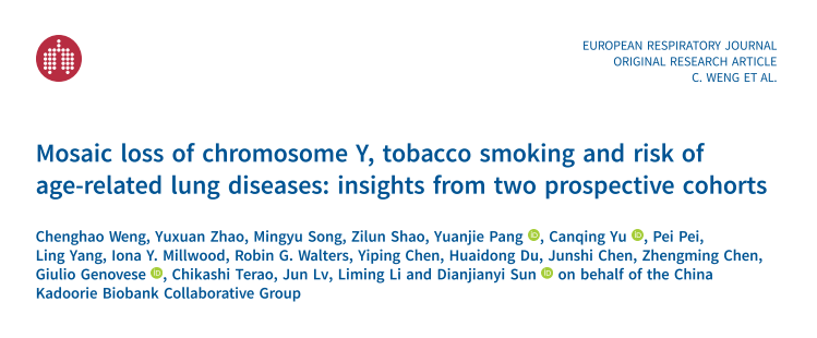2024年9月11日,中国慢性病前瞻性队列研究团队(China Kadoorie Biobank,CKB)在European Respiratory Journal上发表题为 “Y染色体嵌合缺失,吸烟与年龄相关肺疾病之间的关联:来自两大前瞻性研究的证据(Mosaic loss of chromosome Y, tobacco smoking, and risk of age-related lung diseases: insights from two prospective cohorts)”的研究成果,该研究综合英国生物银行(UKB)和中国慢性病前瞻性队列研究(CKB)两大队列数据,发现Y染色体嵌合缺失(Mosaic loss of Y chromosome,mLOY)与总体肺部疾病、慢性阻塞性肺疾病(Chronic obstructive pulmonary disease,COPD)、肺癌(Lung cancer)以及特发性肺纤维化之间的关联,以及mLOY和吸烟对于年龄相关肺疾病的协同作用,证实mLOY作为肺部疾病预测因子和生物标志的可能性。