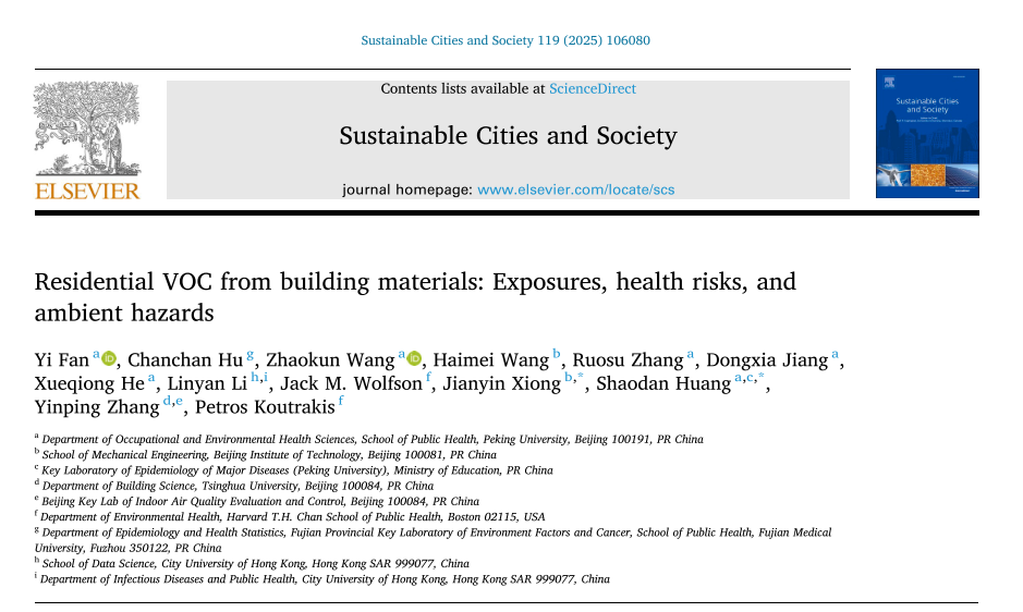 2024年12月16日,北京大学公共卫生学院黄少丹研究员团队在《Sustainable Cities and Society》杂志在线发表了题为《住宅建筑材料中的VOC:暴露、健康风险和环境危害》(Residential VOC from building materials: Exposures, health risks, and ambient hazards)的研究成果。室内挥发性有机化合物(VOCs)作为建筑材料中的常见污染物,在中国引起广泛关注,但其在全国范围内的室内暴露、健康风险和环境影响尚未得到充分研究。本研究基于9个城市279处住宅中53种VOCs的排放机制和测量数据,分析了室内浓度与温度、湿度、通风、负载率和装修时间的关系。利用蒙特卡罗方法,研究估算了中国31个省份前10种VOCs的平均住宅浓度及健康风险。结果表明,住宅VOCs暴露存在显著的时空差异,南方和夏季地区的浓度通常较高。同时,住宅VOCs对环境的影响显著,尤其是甲醛、1,2-二氯丙烷和异丙苯,它们分别占大气环境中人为排放总量的13.169%、14.779%和2.475%,且城市的排放量明显高于农村。研究还发现,住宅VOCs的增加促进了臭氧和二次有机气溶胶的生成,排放量超过了之前研究中98种人为源的半数。研究强调,降低住宅VOCs水平,特别是在城市地区,是改善室内健康和减少环境危害、促进可持续发展的紧迫任务。