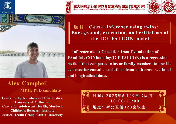 为促进和提升双生子研究特殊方法学的学习和应用,2025年5月29日,重大疾病流行病学教育部重点实验室(北京大学)双生子课题组邀请墨尔本大学博士研究生Alex Campbell进行了题为“Causal inference using twins: Background, execution, and criticisms of the ICE FALCON model”的交流分享会。