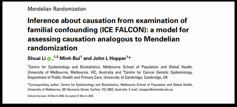 随后,Alex Campbell分享了ICE FALCON方法的原理及其应用。ICE FALCON(Inference about Causation through Examination of FAmiliaL CONfounding)方法于2020年由墨尔本大学John Hopper教授和李帅副教授提出,是一种利用家系数据,特别是双生子数据,通过回归分析对潜在的因果关系进行推断的方法。目前,此方法已被澳大利亚、丹麦、瑞典及中国双生子登记系统等的研究人员应用于探索多种表型背后的潜在因果关系。