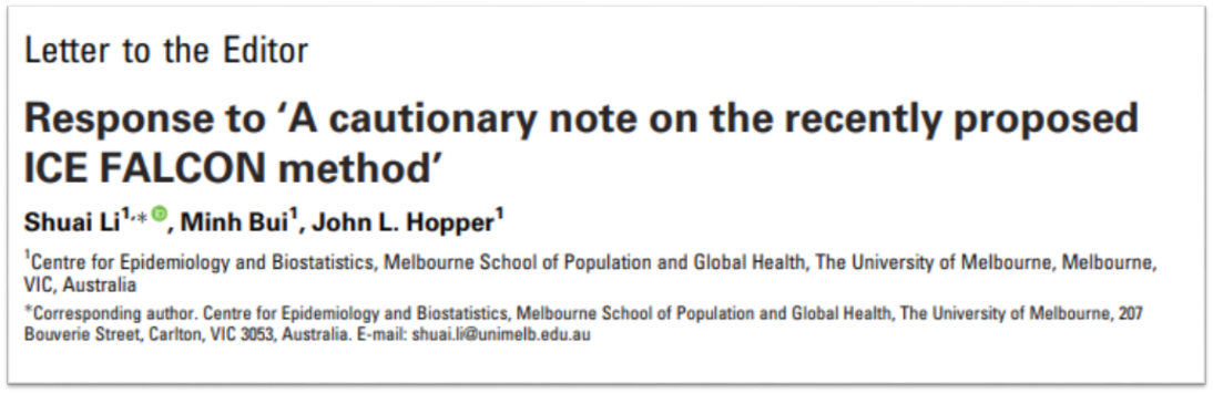 但是该方法于去年受到质疑,有文章指出ICE FALCON方法忽略了个体内未测量混杂因素的影响,对此,Alex Campbell分享了课题组回应质疑的过程。经验证,当个体内混杂因素占总混杂因素的比例不超过90%的情况下,回归系数仍然稳健,并在随后的文章中,对ICE FALCON模型的稳健性提供了更多证据,因此仍然认为ICE FALCON方法可以作为一种验证性分析,利用双生子特殊的家系结构的横断面数据,检验因果关系的方向。